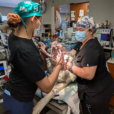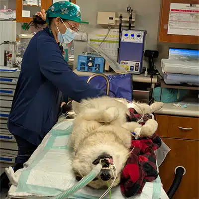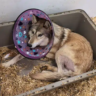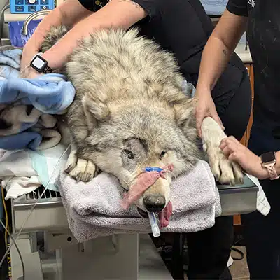 Our 9 year old mid-content wolfdog, Kaya, was observed by staff with a distended stomach and appeared to be in general discomfort. Whenever there is the potential for bloat, our staff has to move fast to capture/sedate the animal and get them on the road ASAP! Every second counts with bloat, as some animals can die within 1-2 hours if they don’t receive treatment.
