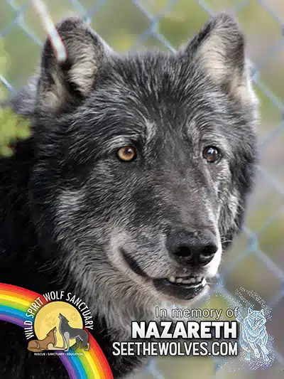 Nazareth was born in 2005 and arrived at Wild Spirit in March of 2016. He came to the sanctuary alongside his companion, Angel, after his owner purchased him from a breeder in North Carolina. They were both eventually surrendered to Lake Tahoe Wolf Rescue in Nevada.