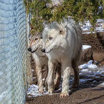 Ever since her arrival, Motaki has been paired with our strapping young lad, Sevro! The two are not an especially affectionate couple, but if there is one thing they love, it is causing havoc with their neighbors! Whether it be patrolling their fence line with her meal in maw, or growling and snarling at rescues being walked on leash outside their enclosure, these trouble makers ensure their voices are heard!
