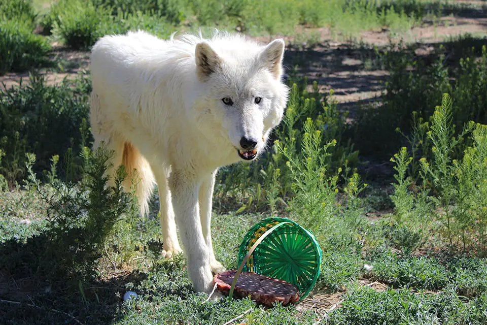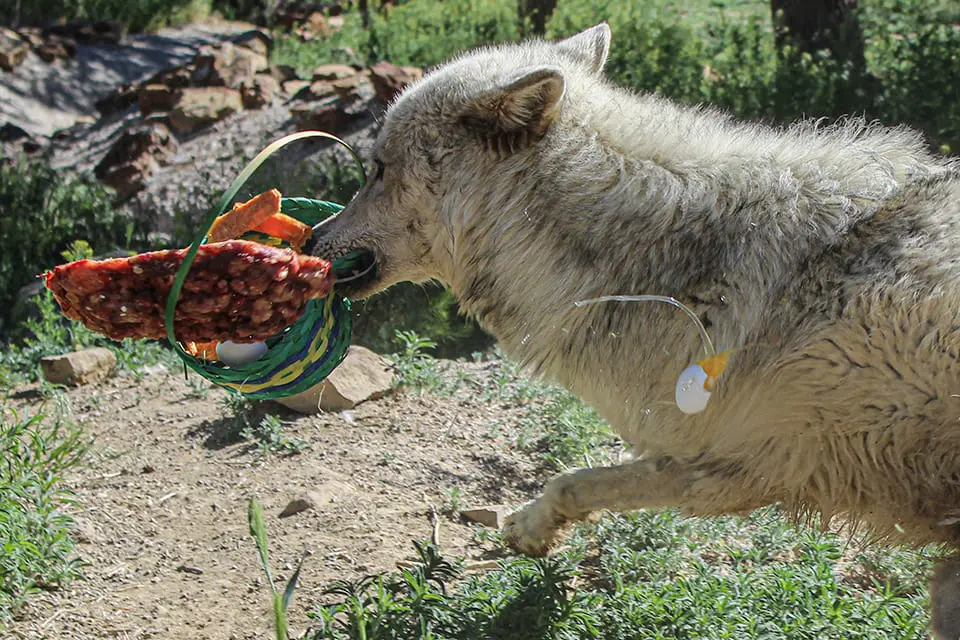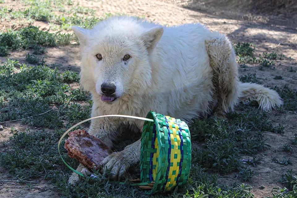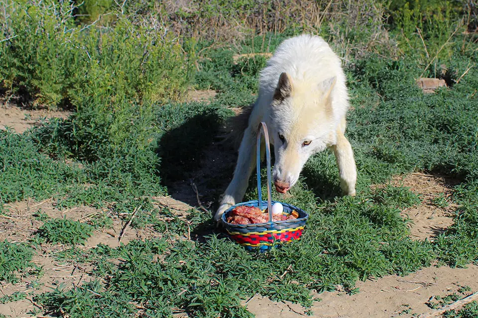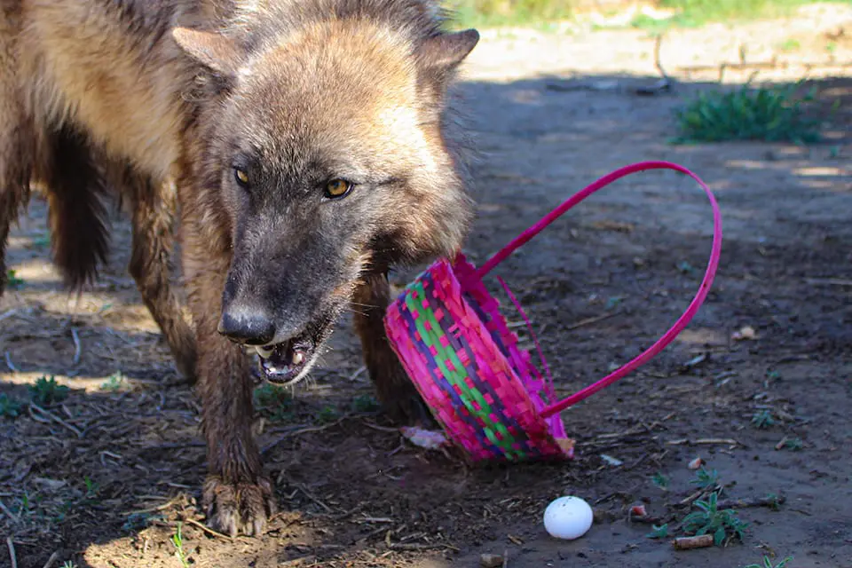 Wolfdog rescue, Brienne, receiving spring basket enrichment, 2020