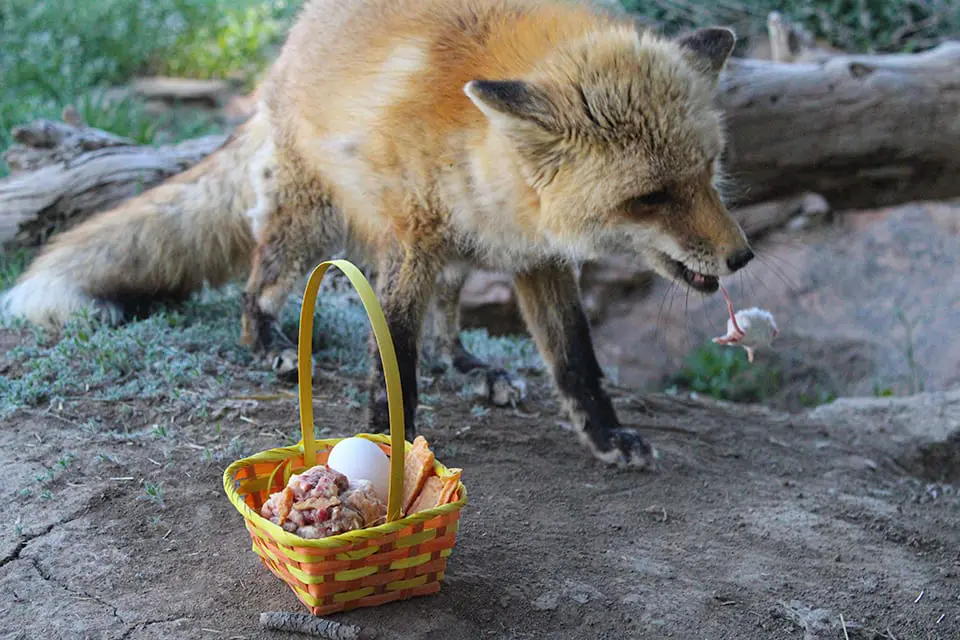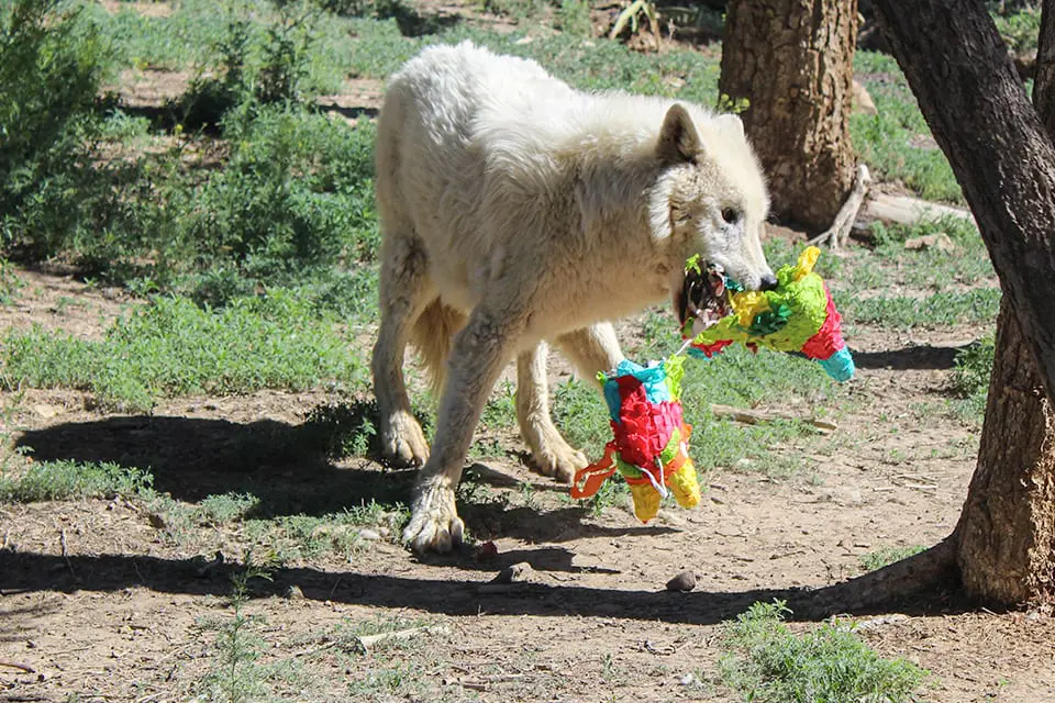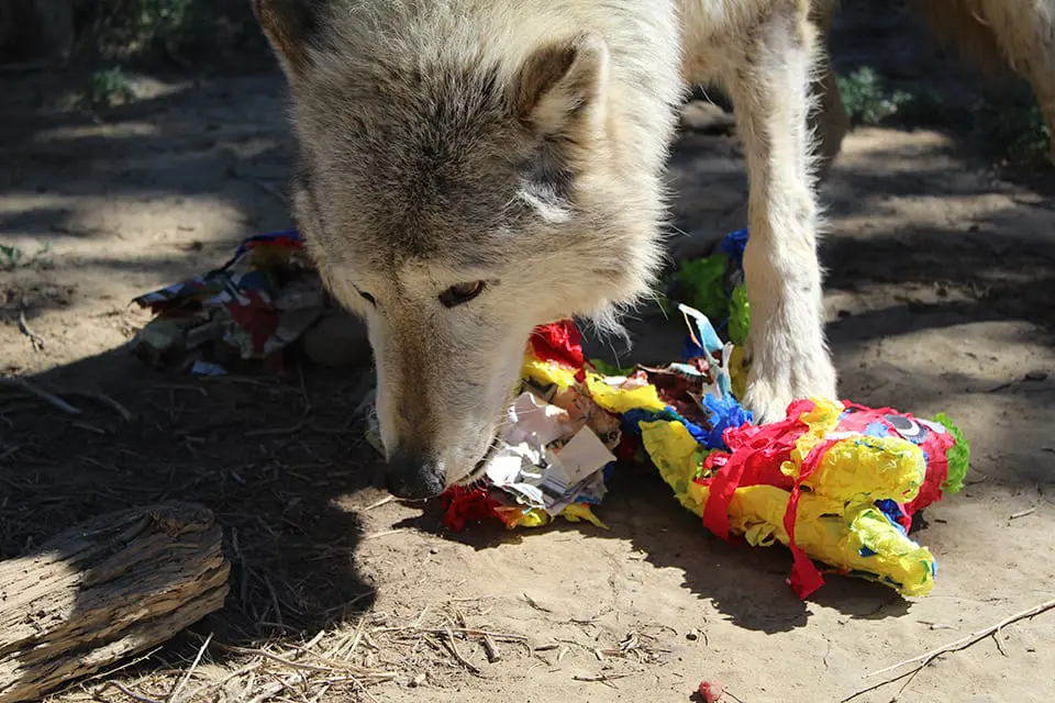 Shy coyote, Lyla Rose, thinks the human might be too close to enjoy her present.