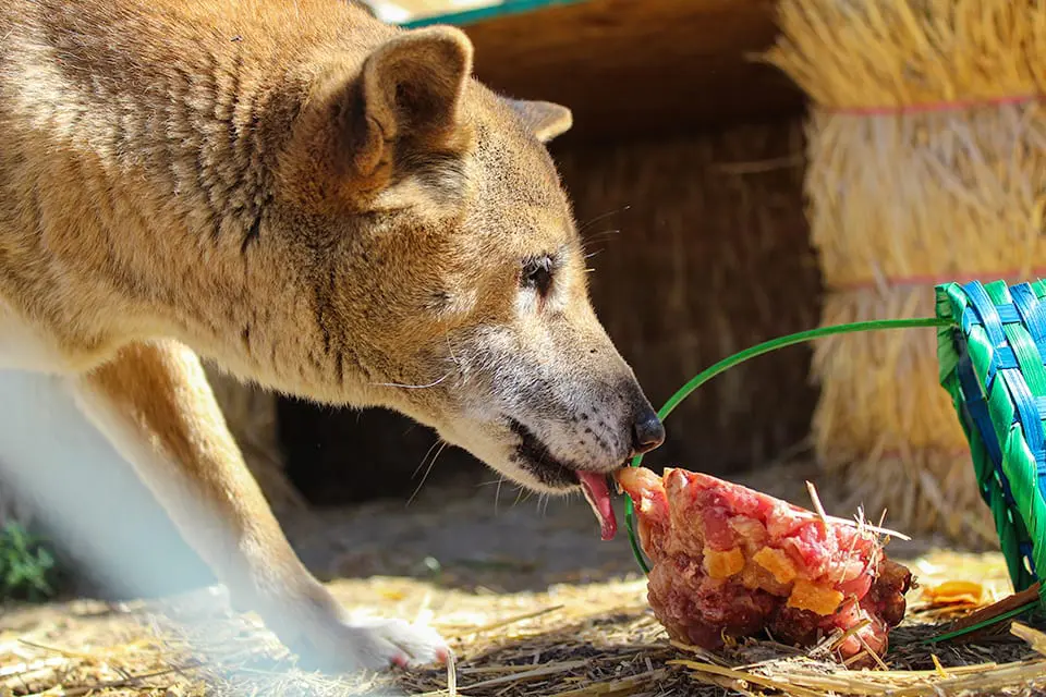 One of our shy New Guinea singing dogs, Reba, tentatively investigates her treats.