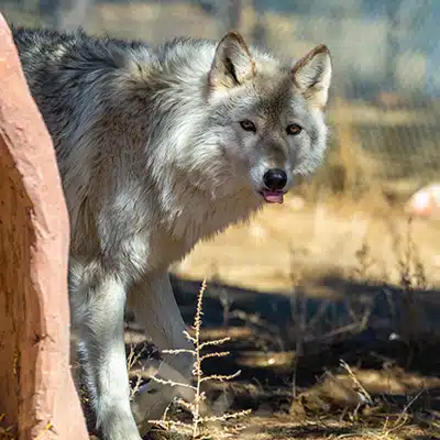 Kiska and Zeebie have touched so many lives during their time as Ambassadors, and many of their fans from New York still support them after their move to New Mexico. These two share such a special bond that it is hard not to fall in love with them! To Kiska, Zeebie is like a father figure that she whole-hearted respects. To Zeebie, Kiska is his wild child that he has not been able to keep up with for ages. Both have made it clear that their Ambassador days are behind them, graciously enjoying retirement at Wild Spirit. They still happily greet our tour guests who venture past their enclosure, but sometimes Kiska will express that even our Caretakers are not welcome into the enclosure on particular days. Zeebie, on the other hand, is such a docile and calm fellow that he is always willing to welcome us into his space.