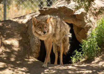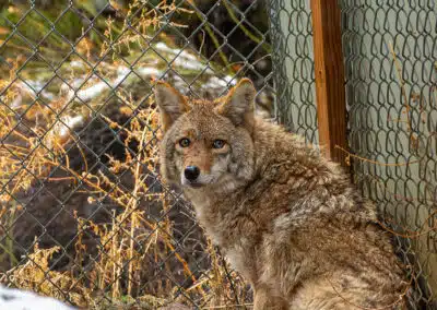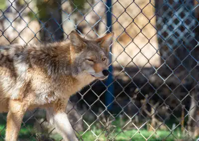 Maine’s rescuer contacted Wild Spirit and told us all about this deserving boy. At the time, we had a single female coyote named Yuni who needed a companion, making the decision to rescue Maine quite easy to make. We welcomed him in January of 2017 when he was 10 months old. Maine was nervous on his way to the sanctuary, and it took him some time to settle into his new home. Fortunately, he and Yuni get along very well together, and with her help, he has settled into a comfortable, happy life in our care.