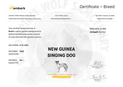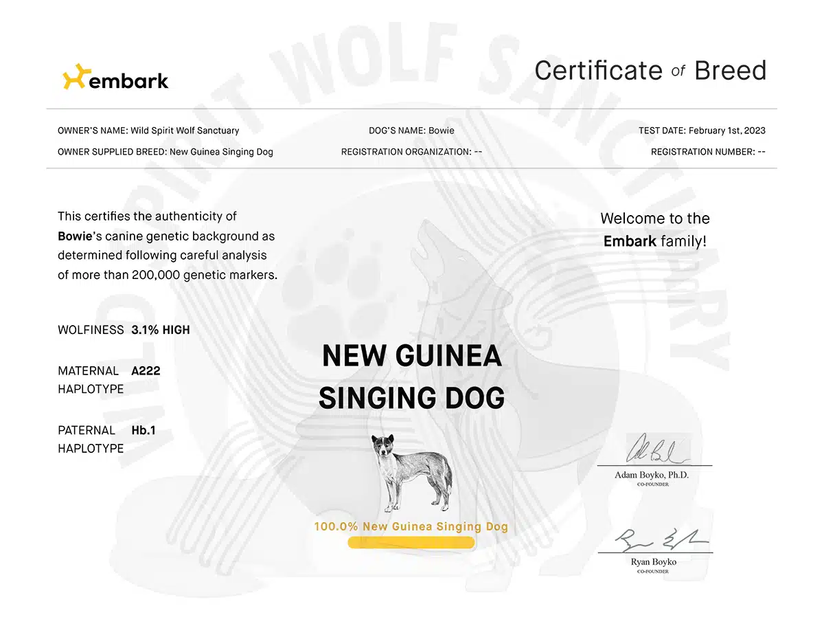 Some consider the rare and wild New Guinea singing dogs to be most like dingoes, but others report that they have completely unique DNA. They get their name from their equally unique howl which is nearly impossible to describe. Some say it sounds like a barbershop quartet, and others describe it as an ethereal trill. When we rescued Bowie, we heard there were less than 200 New Guinea singing dogs in captivity, and that they may already be extinct on their native island of Papua New Guinea. We read that on the island, Singers were seen more in pairs than in packs. Recently, however, we learned that a very small number of wild singers still exist on their native island!