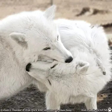 Alice was born on May 3rd, 2006 and arrived at Wild Spirit May 22nd that very same year. Alice and her siblings were born to captive-bred parents, Yukon and Sierra, at a breeding facility. The story we heard was that Yukon and Sierra were born to wolves who were taken from the wild. The breeder who owned the pair had been selling their pups to select private owners, or for exhibits like zoos, for eight years.