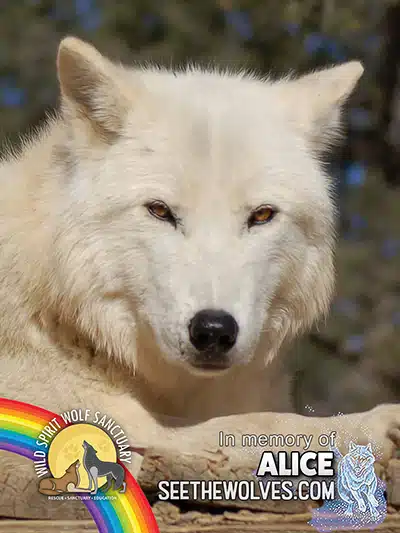 Alice will always be very special to me. I was her first sponsor from the time she came to Wild Spirit in 2006 and through all the years of her life until her passing in 2021 and, perhaps, that is the reason I always felt such a strong connection to her. I have kept and framed, in 2 large frames, all her picture magnets, as well as some other photos of her. She was a beautiful wolf and a beautiful soul in every way and her image and memory will remain with me always.