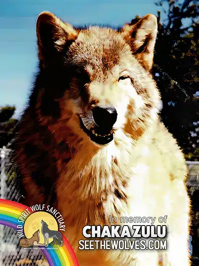 Chaka Zulu was born on Wild Spirit property on April 7th, 1996, near the beginning of the sanctuarys’ “conception” itself! He was one of seven pups in a litter that was bottle raised by staff, and born by Ammon Ra and Nashoba–two other wolves residing at the sanctuary.
