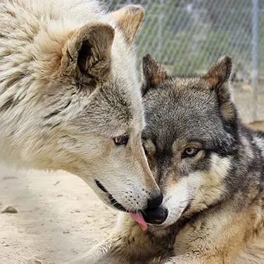 When Cheyenne finally arrived at Wild Spirit Wolf Sanctuary, she was overwhelmed by all the other canines. We thought she would be a good match for our rescue, Raven, who had recently lost his companion, Doska. Initially, 6-month-old Cheyenne seemed afraid of Raven. We introduced them on leashes outside of the habitat at first, to see how they would react to each other. All seemed well, so we let them go inside of Raven’s habitat. Very quickly, they got along very well together.