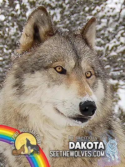 Dakota was born in April of 2006, and arrived at Wild Spirit in June of that very same year. Shortly after we rescued the litter of Arctic wolf pups (Alice, Thunder, Sabine, Sugar, Storm and Powder), a friend of Wild Spirit called to see if we were interested in more puppies. A litter of 8 Arctic-Timber crosses had been born in Oregon to a man who did not know what to do with them. We explained that we really had our hands full already and wouldn’t be able to take them. However, a former staff member who was planning to open a sanctuary in Ohio was eager to take the Arctic-Timber litter.