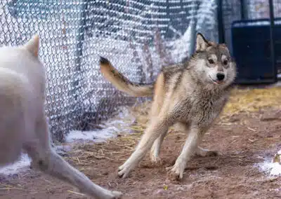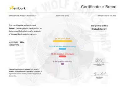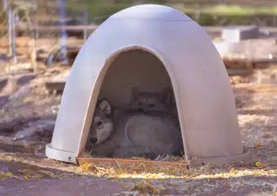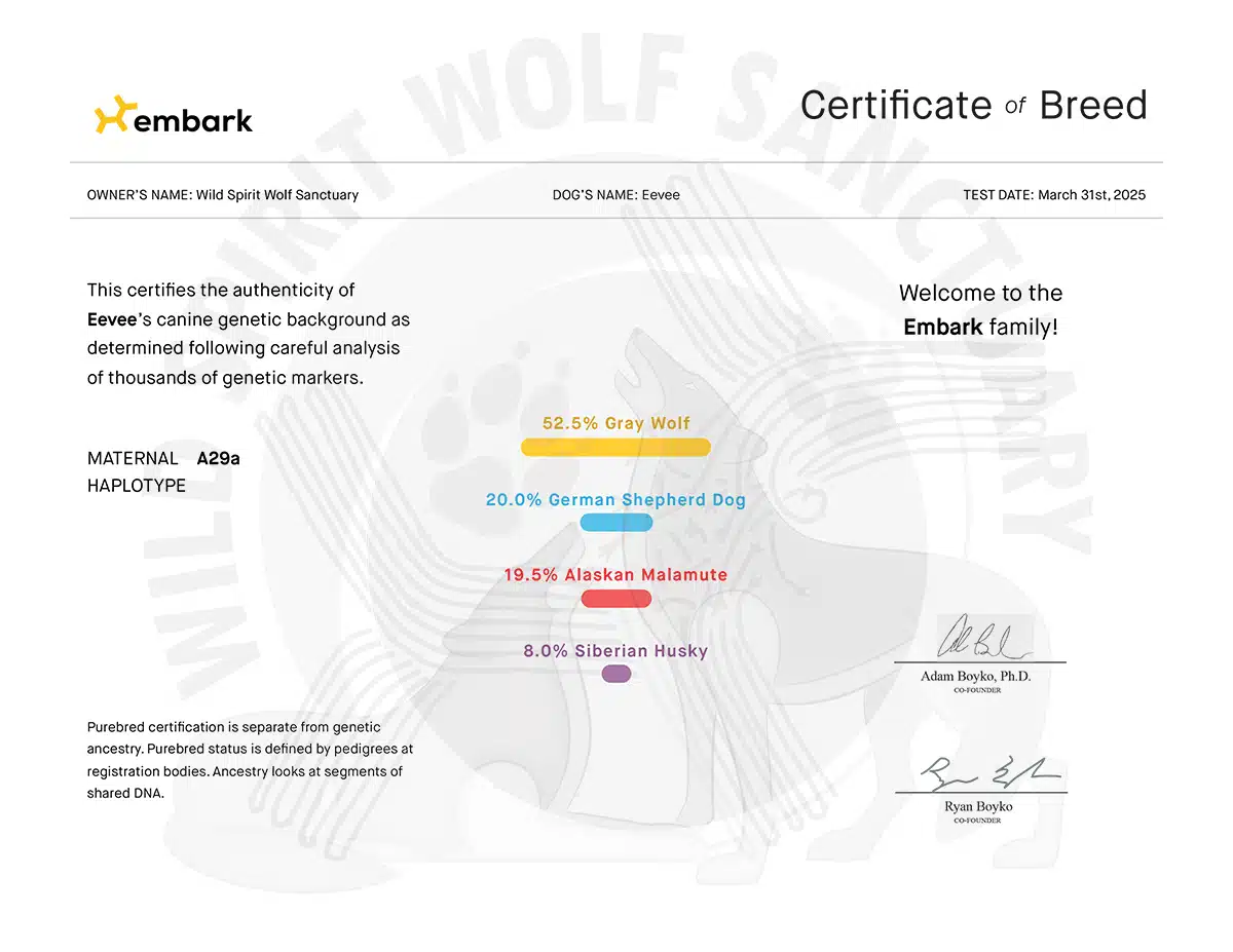 On the first trip, Wild Spirit selected eight animals to spend the rest of their lives in our care. Among these were seven wolfdogs (Kirara, Niohuru, Jethro, Korah, Princess Poppy, Eevee, and Aurora) and one coydog (Captain).