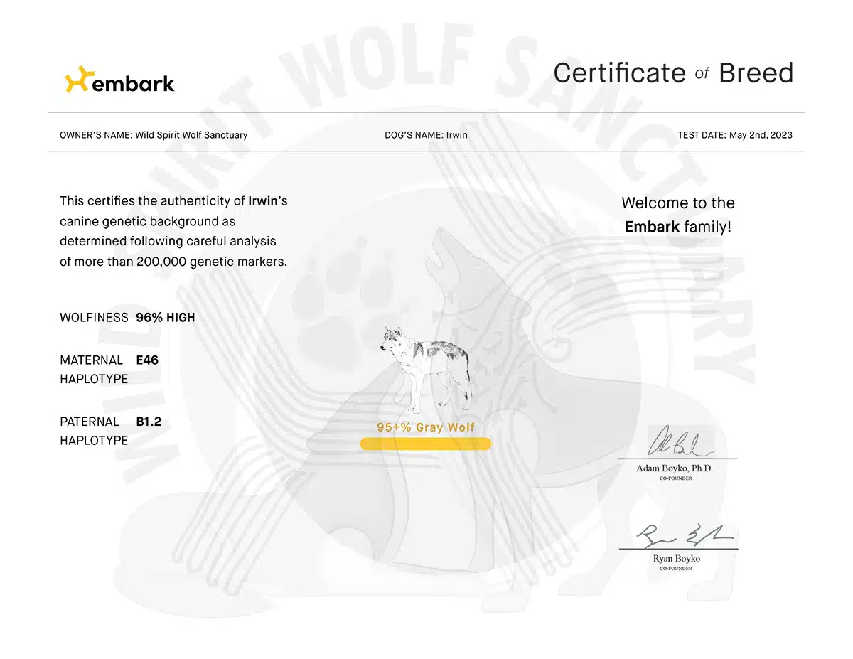 Before life at Wild Spirit Wolf Sanctuary, high-content wolfdog Irwin was born to a breeder in Ohio and sold as a pet to a private owner. He remained in his original home for the first several years of his life, raised alongside the family’s black lab, who loved him like one of her own. Unfortunately, a day came in which Irwin demonstrated some undesirable behaviors toward his owner, who quickly realized that he was not the pet she hoped he would be. As a result, she began searching for a new home for him.