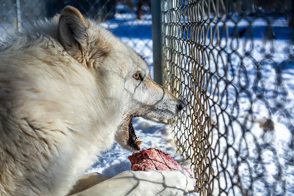 Months later, however, we found a potential opening for handsome Irwin. As fate would have it, our lovely high-content wolfdog Naia had been removed from her shared habitat with Arctic wolf, Flurry, as the two had become incompatible as Naia grew older. As such, we began to consider a new companion for her and Irwin came to mind immediately. Being much younger than Flurry and with higher energy and (ideally) greater patience with Naia, we hoped that the two might be a great fit!