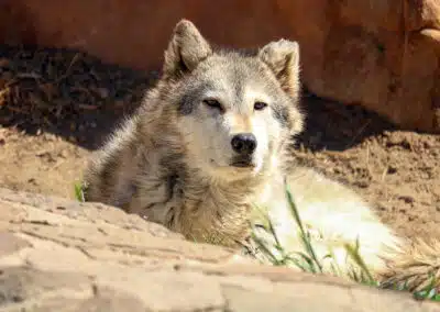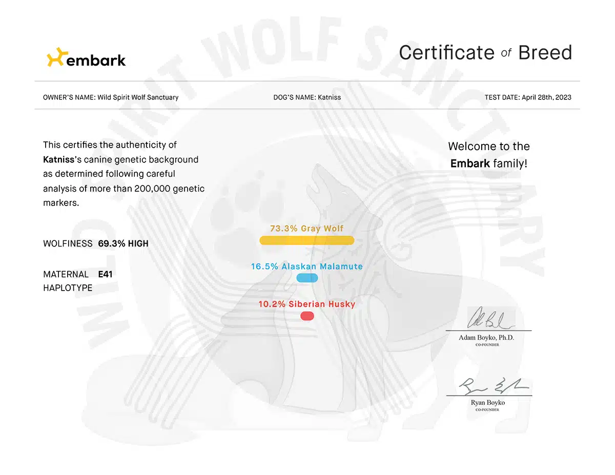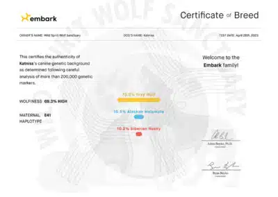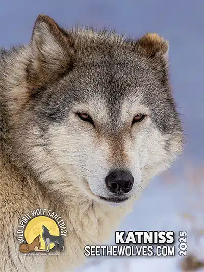 Katniss came to live at Wild Spirit Wolf Sanctuary in May of 2021 along with her companion, Sarkhan, who had begun demonstrating a number of concerning behavioral changes toward the couple who owned them. Despite the fact that he was raised with an incredible amount of love and socialization, they explained that upon reaching sexual maturity, Sarkhan had become increasingly aggressive toward them, acting out with such intensity that it became impossible for them to care for him or Katniss safely.
