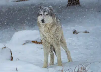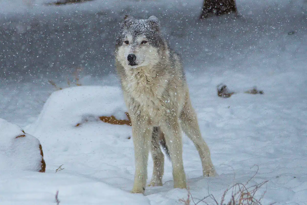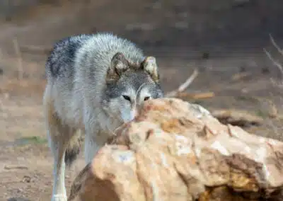 Upon arrival at the couple’s home, we were introduced to Katniss and Sarkhan, who demonstrated very different comfort levels around people. Sarkhan, for example, was very confident in our presence, but immediately began to display the aggressive behaviors we were warned about, approaching the fence line with hackles raised and snarling loudly. Katniss, on the other hand, seemed shy but curious, electing to keep a healthy distance from the new strangers.