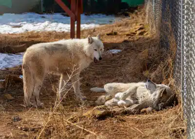 Unfortunately, the remaining adults were isolated in cement-bottom cages at LAAS for over 6 months without exercise or human contact. They were depressed, scared, and their muscles began to atrophy from lack of movement. They also developed skin issues from sitting in their own urine. Kabbalah, Lyca’s father, began slipping away because of conditions at LAAS. Still involved and hoping to see a happy ending for these animals, Ms. Brooks contacted Wild Spirit and we began the process of helping with the rescue. Staff eventually went to California to plead with LAAS to release the wolfdogs to a vet for immediate medical care before we offered them their permanent home. Thankfully, they were finally taken to the fantastic organization, Veterinary Angels Medical Center, and began receiving life-saving treatments.