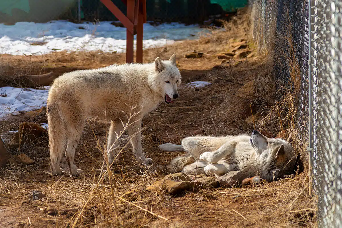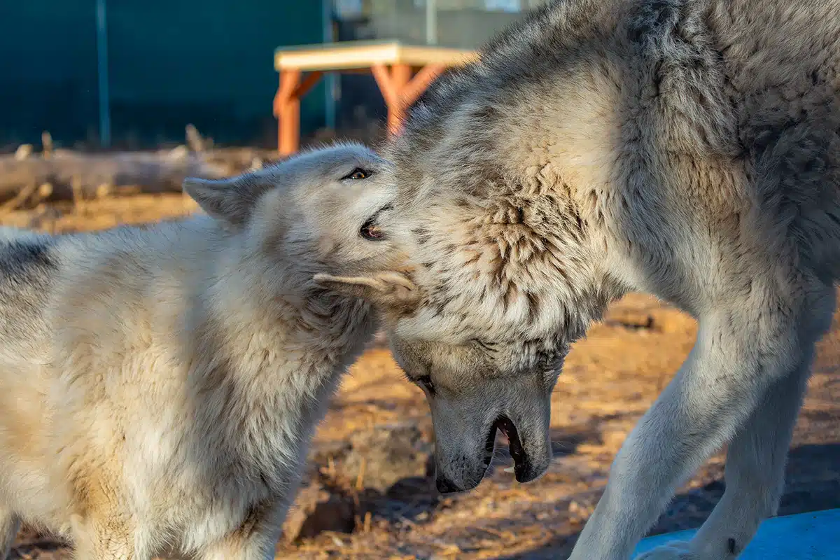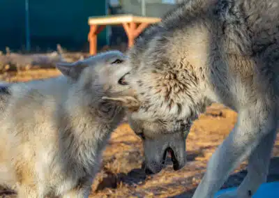 Staff also went to the place where Nushmua’s puppies had been taken to offer them a home with us. It was a heartbreaking decision for the woman who was caring for them, since she had become extremely attached. She finally agreed it was best for two of them, Leia and Quinn, to come to Wild Spirit, and eventually, another female, Lyca, would come to join us as well. The long trip home went well and all the rescues arrived safely. It’s possible that the moment they arrived at the sanctuary was the first time the adults had felt soil beneath their feet, and understandably, it took them a while to fully grasp how transformed their lives were. They were nervous and confused but seemed relieved to be free from the shelter and their previous abuse.