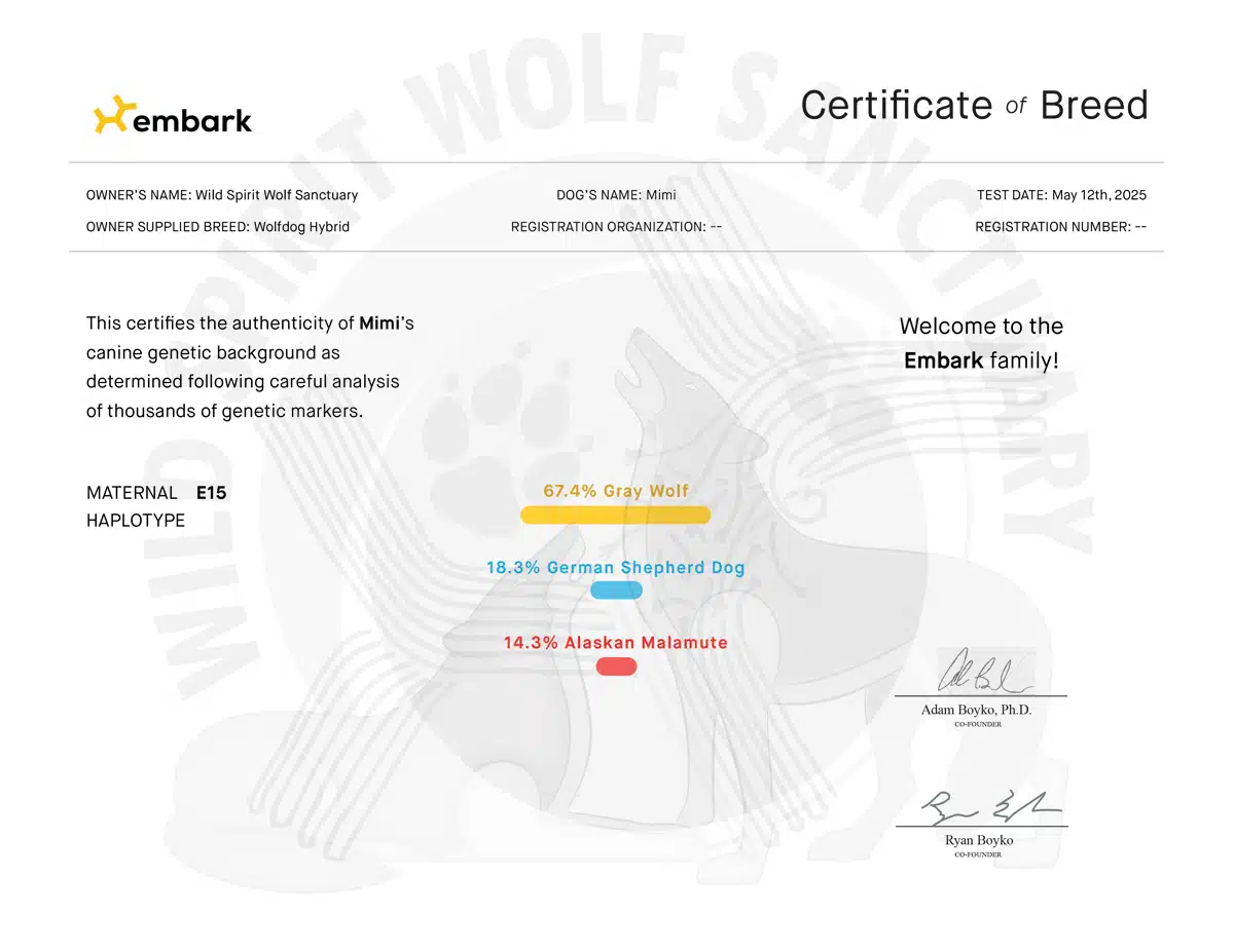 On the first trip, Wild Spirit selected eight animals to spend the rest of their lives in our care. Among these were seven wolfdogs (Kirara, Niohuru, Jethro, Korah, Princess Poppy, Eevee, and Aurora) and one coydog (Captain).