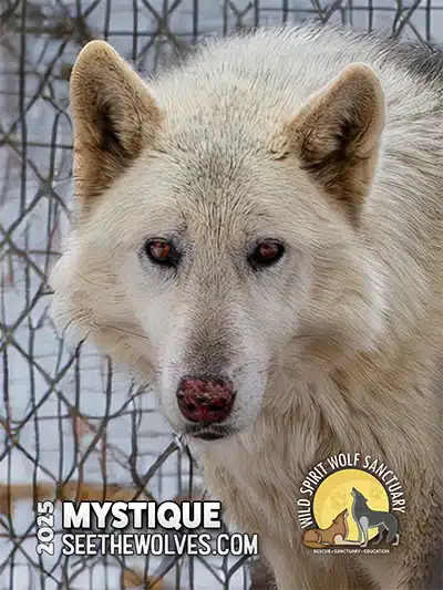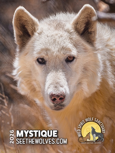 Like most of our rescues, Mystique has a heartbreaking and traumatic past. The story of her rescue began when a wolfdog escaped from horrible conditions and was running loose in a California neighborhood, struggling to survive. Everyone thought the poor canine was a pure wolf at first, and she soon caught the attention of two celebrities living in the neighborhood. Grammy-nominated singer/songwriter/producer Meredith Brooks commented, “I was inducted into the world of breeders, hoarders, exploitation of illegal exotic animals, neglect, and abuse of the innocent when I looked out my window and saw a wolf on my little street nestled in the canyon.” Ms. Brooks’ celebrity neighbor and fellow animal champion also stepped in to help. Reality star/model and founder of Angels for Animal Rescue, Joanna Krupa, worked hard to gain the wolfdog’s trust and soon she was comfortable approaching Ms. Krupa as she sat on the ground. Her efforts brought more attention to the situation and also demonstrated to people that the “wolf” was not dangerous. Thankfully, she was eventually captured and has started a new life at another sanctuary.