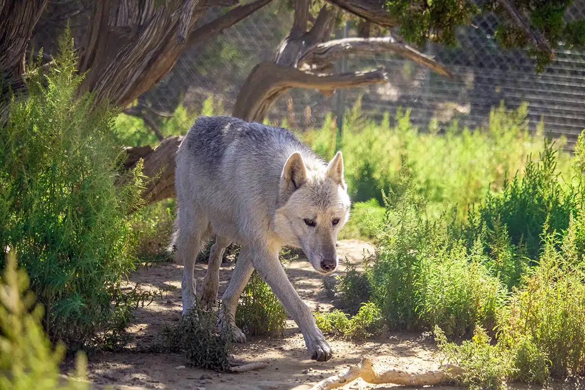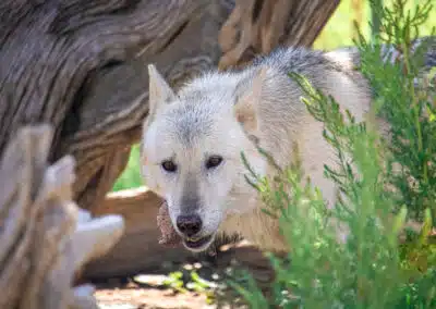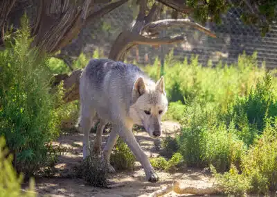 Unfortunately, the remaining adults were isolated in cement-bottom cages at LAAS for over 6 months without exercise or human contact. They were depressed, scared, and their muscles began to atrophy from lack of movement. They also developed skin issues from sitting in their own urine. Kabbalah, Mystique’s brother, began slipping away because of conditions at LAAS. Still involved and hoping to see a happy ending for these animals, Ms. Brooks contacted Wild Spirit and we began the process of helping with the rescue. Staff eventually went to California to plead with LAAS to release the wolfdogs to a vet for immediate medical care before we offered them their permanent home. Thankfully, they were finally taken to the fantastic organization, Veterinary Angels Medical Center, and began receiving life-saving treatments.