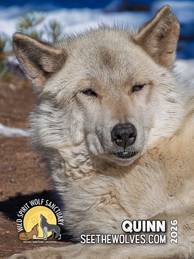 Like most of our rescues, Quinn has a heartbreaking and traumatic past. The story of his rescue began when a wolfdog escaped from horrible conditions and was running loose in a California neighborhood, struggling to survive. Everyone thought the poor canine was a pure wolf at first, and she soon caught the attention of two celebrities living in the neighborhood. Grammy-nominated singer/songwriter/producer Meredith Brooks commented, “I was inducted into the world of breeders, hoarders, exploitation of illegal exotic animals, neglect, and abuse of the innocent when I looked out my window and saw a wolf on my little street nestled in the canyon.” Ms. Brooks’ celebrity neighbor and fellow animal champion also stepped in to help. Reality star/model and founder of Angels for Animal Rescue, Joanna Krupa, worked hard to gain the wolfdog’s trust and soon she was comfortable approaching Ms. Krupa as she sat on the ground. Her efforts brought more attention to the situation and also demonstrated to people that the “wolf” was not dangerous. Thankfully, she was eventually captured and has started a new life at another sanctuary.