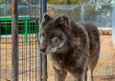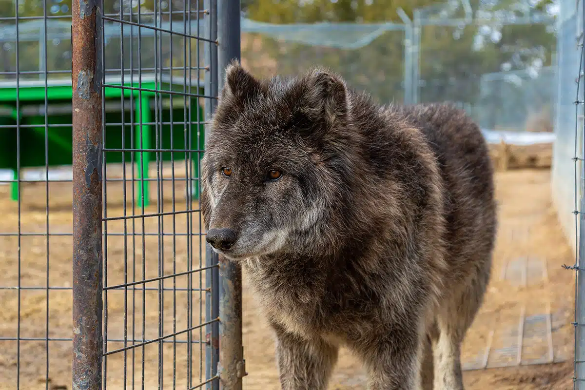 Next, we were told about Enya, an approximately 5- to 6-year-old single female, and the daughter of Kitana. The owners explained that as Enya got older, she began to demonstrate same-sex aggression toward other females, causing her to try to kill several other animals that she had previously had no issues with. Unfortunately, this is extremely common among higher-content wolfdogs, especially females, but with no available male companions on the property, she was forced to remain alone. Knowing we had several single males at Wild Spirit, we decided Enya would make a great addition to our “pack,” and agreed to take her as well.