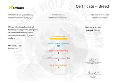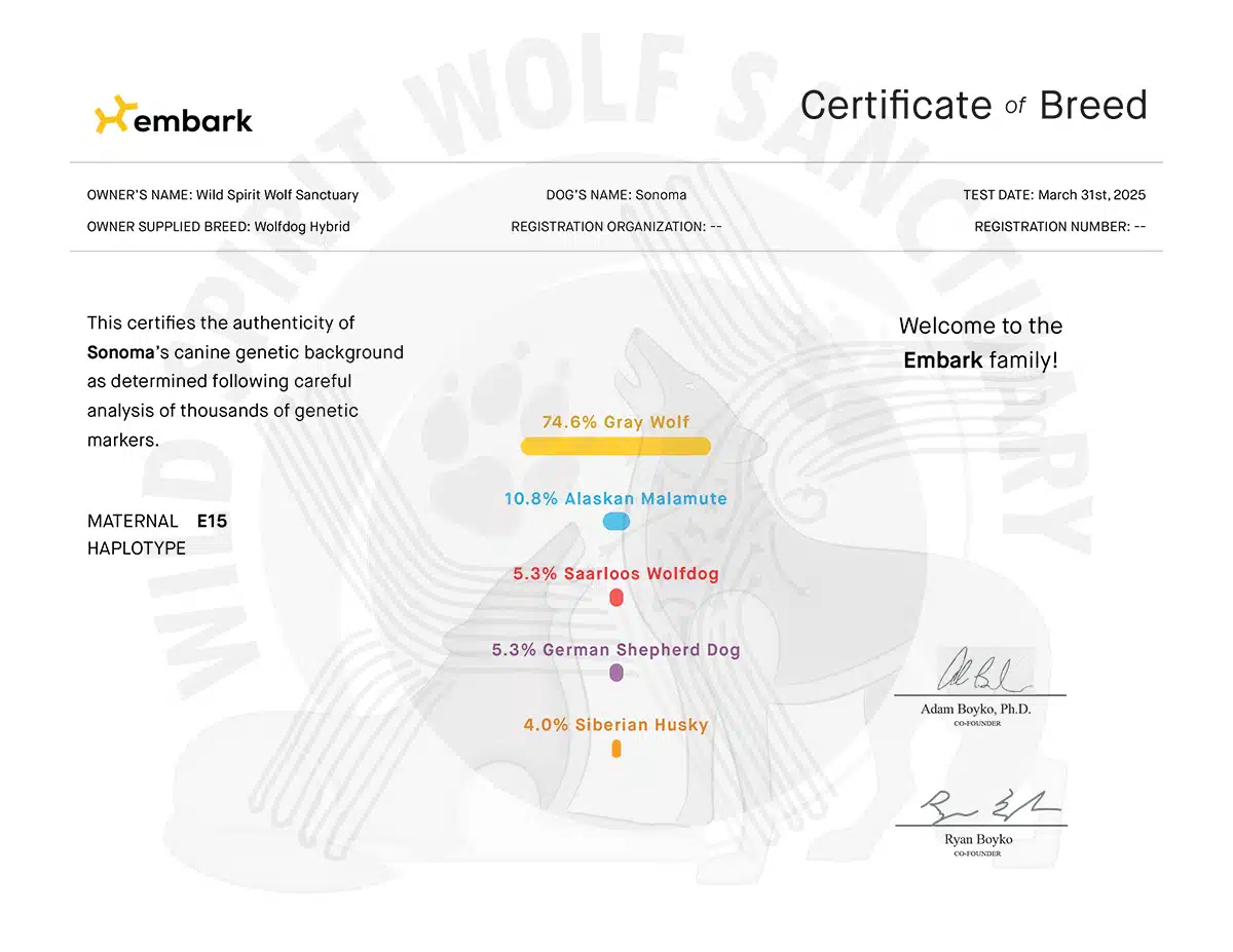 Sonoma has grown into a beautiful wolfdog. She is very playful with her caregivers as well as her companion, Jaeger.