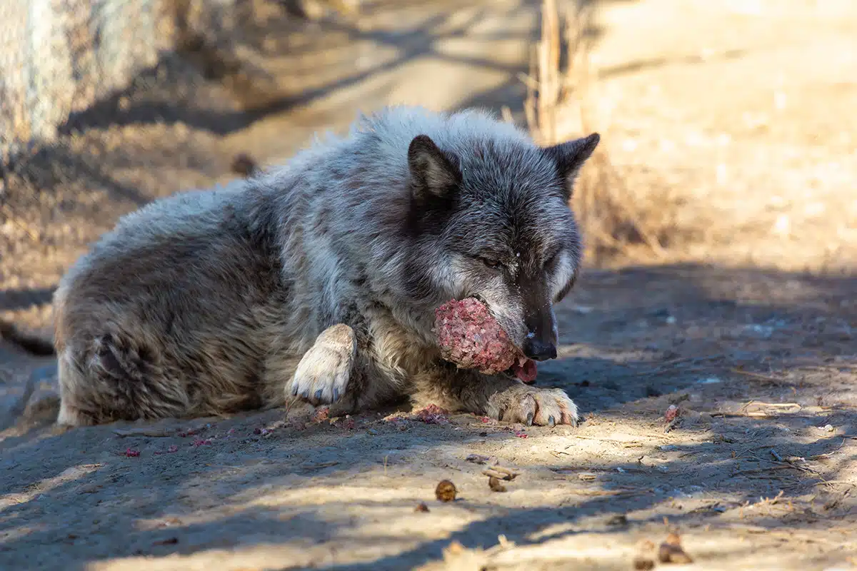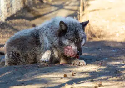 Since his arrival at Wild Spirit, Zeppelin has presented a mostly calm, shy demeanor. He will approach us for treats and enrichment but hasn’t shown much interest in allowing us to pet him as of yet. Thankfully, any aggressive displays he has shown us have been limited so far, and for the most part, it seems like he is just testing our boundaries (as wolfdogs often tend to do).